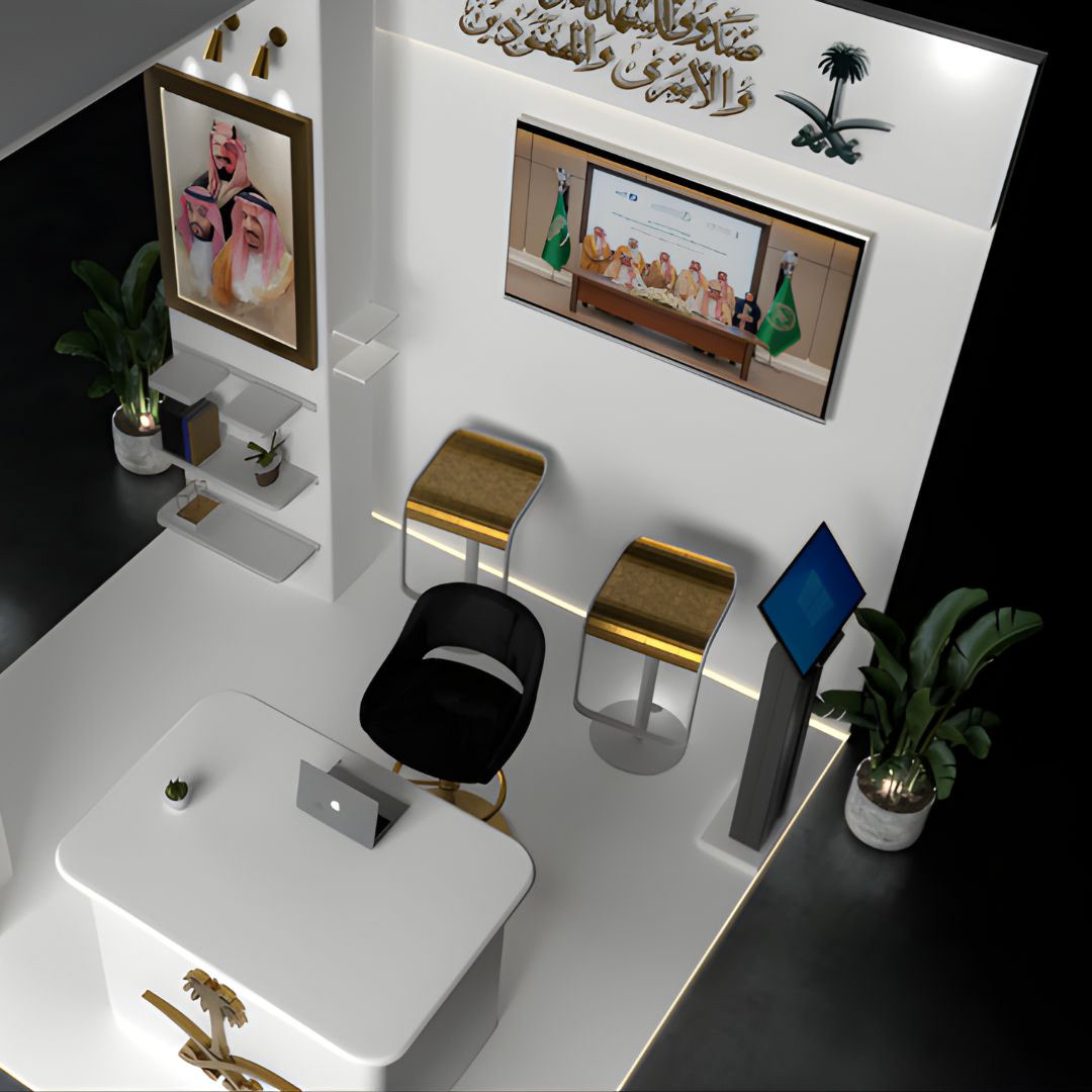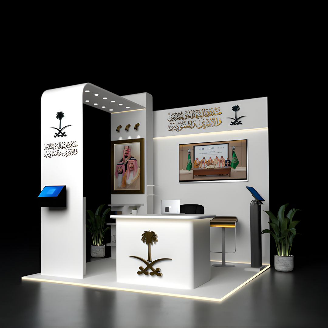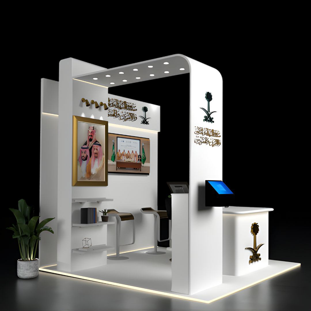 The booth follows a sleek white-and-gold aesthetic, inspired by Saudi visual identity. Clean planes and soft curves give the structure a modern feel, while strategic lighting adds depth and sophistication. Cultural elements, including the Saudi emblem, calligraphic logos, and leadership portraits, reinforce national presence and trust.