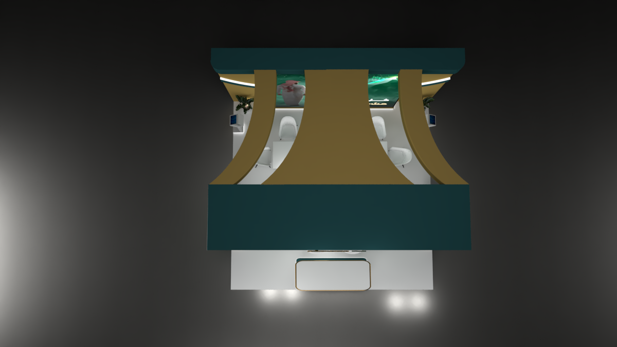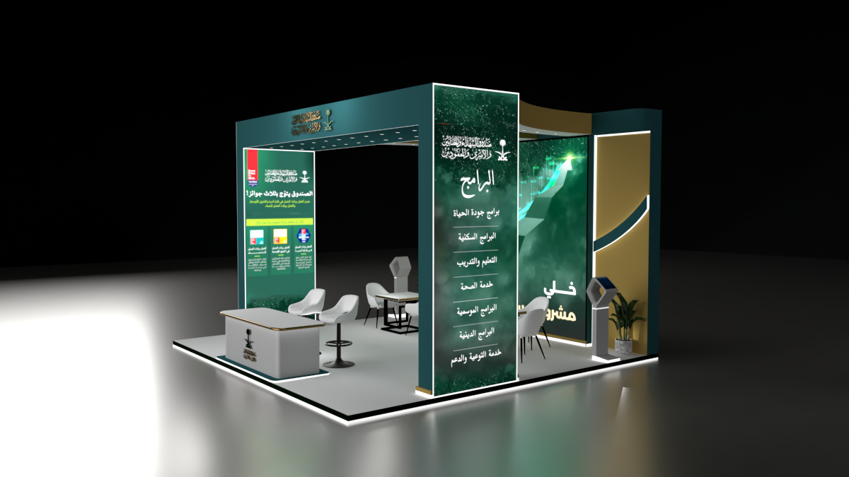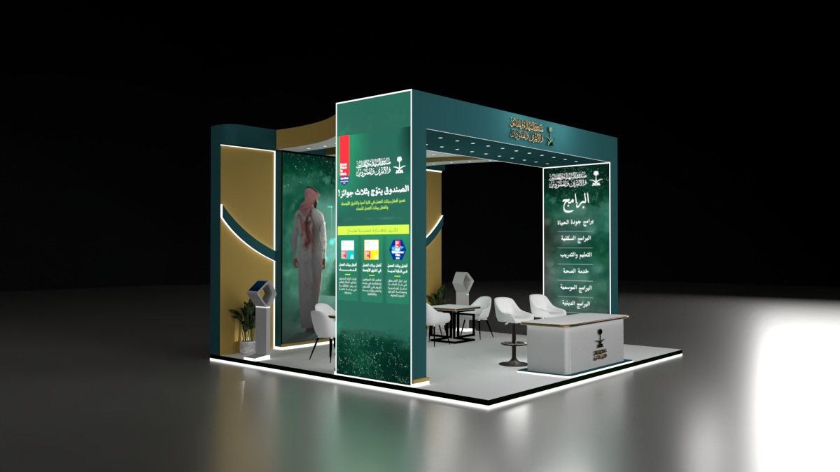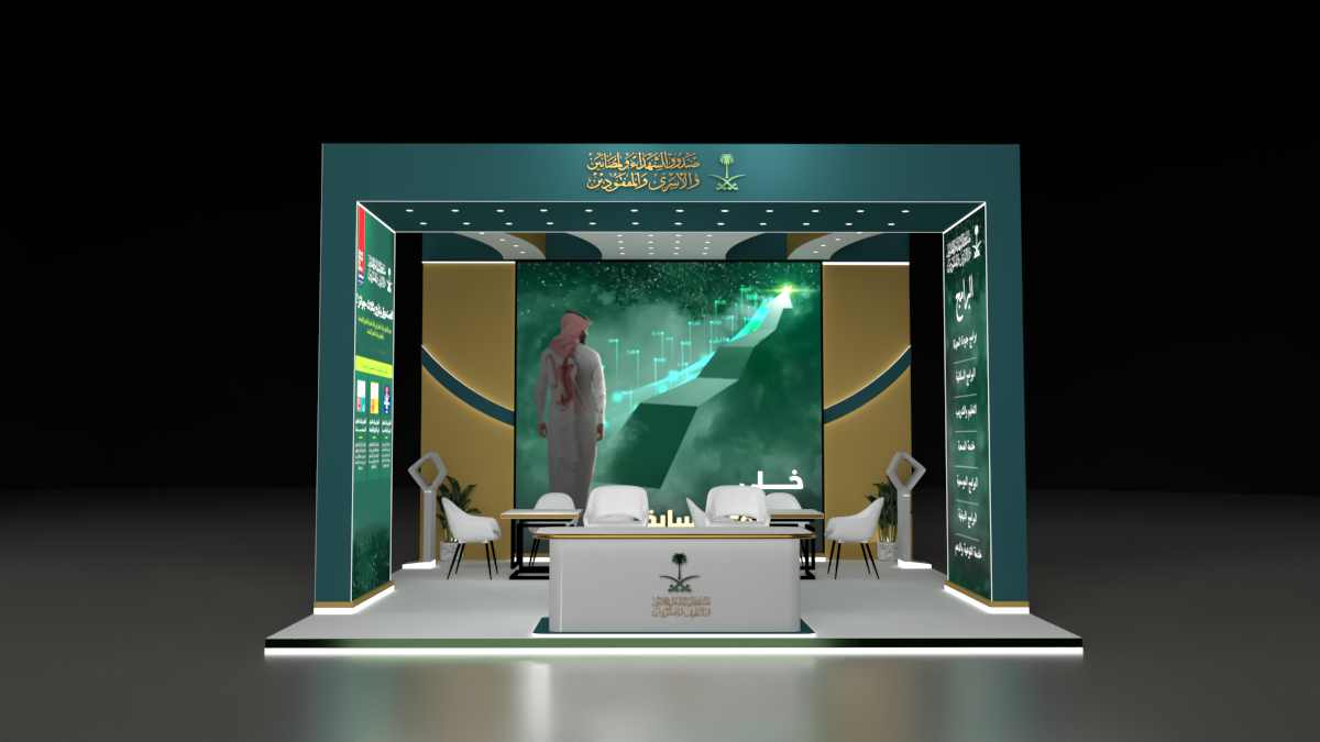 The visual direction is built around ambition, progress, and national identity. A large central LED wall anchors the booth, featuring dynamic motion visuals that symbolize growth and future opportunity. Deep green, gold, and white tones reflect the Saudi palette — premium, formal, and culturally aligned.